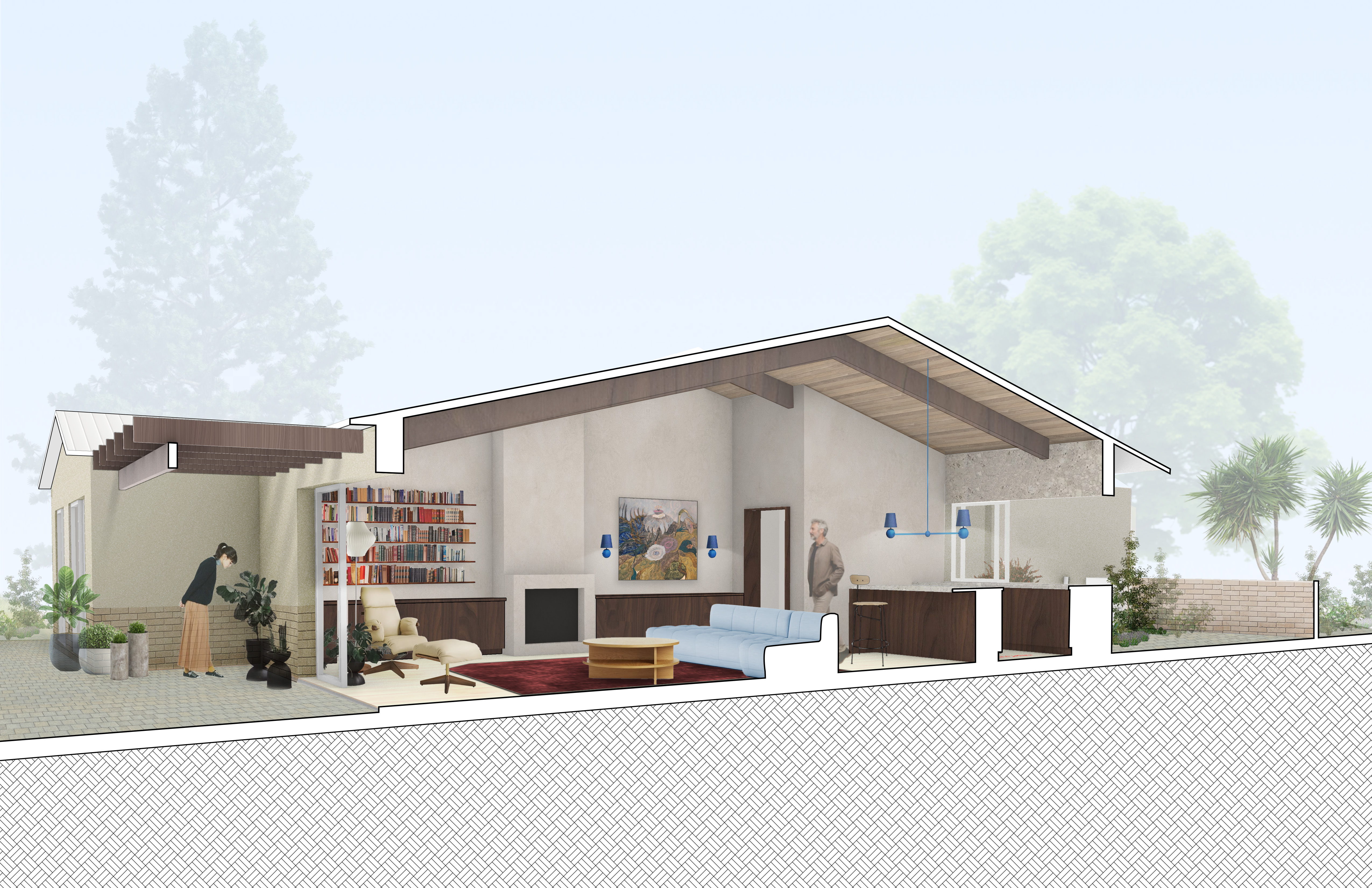 The goal of the project is to open the home from east to west in order to integrate the site as much as possible. The layout shifts to allow for privacy between the parents and child, as well as allow of spaces to gather, play, and entertain.